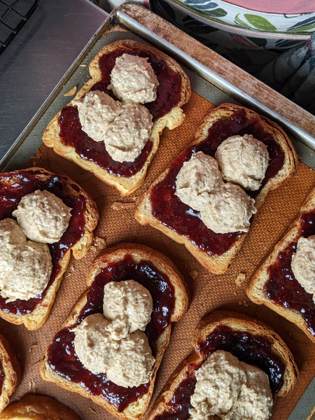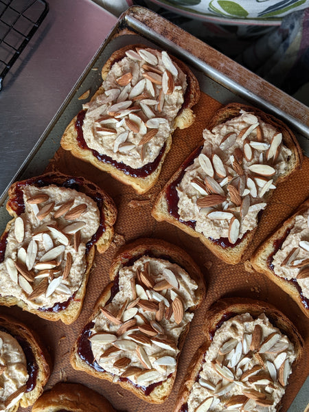 Bostock is a traditional french breakfast pastry made with leftover brioche slices. We use house made brioche for this decadent toast. The bread gets soaked in some syrup, followed by some house made seasonal compote (fig + orange at the moment) and finally topped with almond cream and flakes. The whole thing gets nice and toasted in the oven, perfect to accompany a cup of coffee or earl grey.