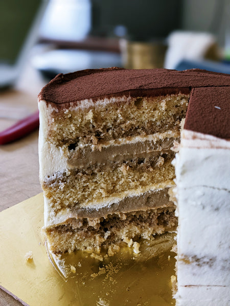 In it's current form, this cake includes 3 layers of a beautiful butter sponge cake which gets soaked with some (okay, a whole lot) of moka pot coffee. Sandwiched between the layers of the cake are two more components. Coffee custard (made using crushed coffee beans) and straight up coffee jelly (moka pot coffee, again) which not only adds more caffeine but also a lightness that's unbeatable. All of this gets covered in a creamy and decadent Mascarpone buttercream which brings everything together.
