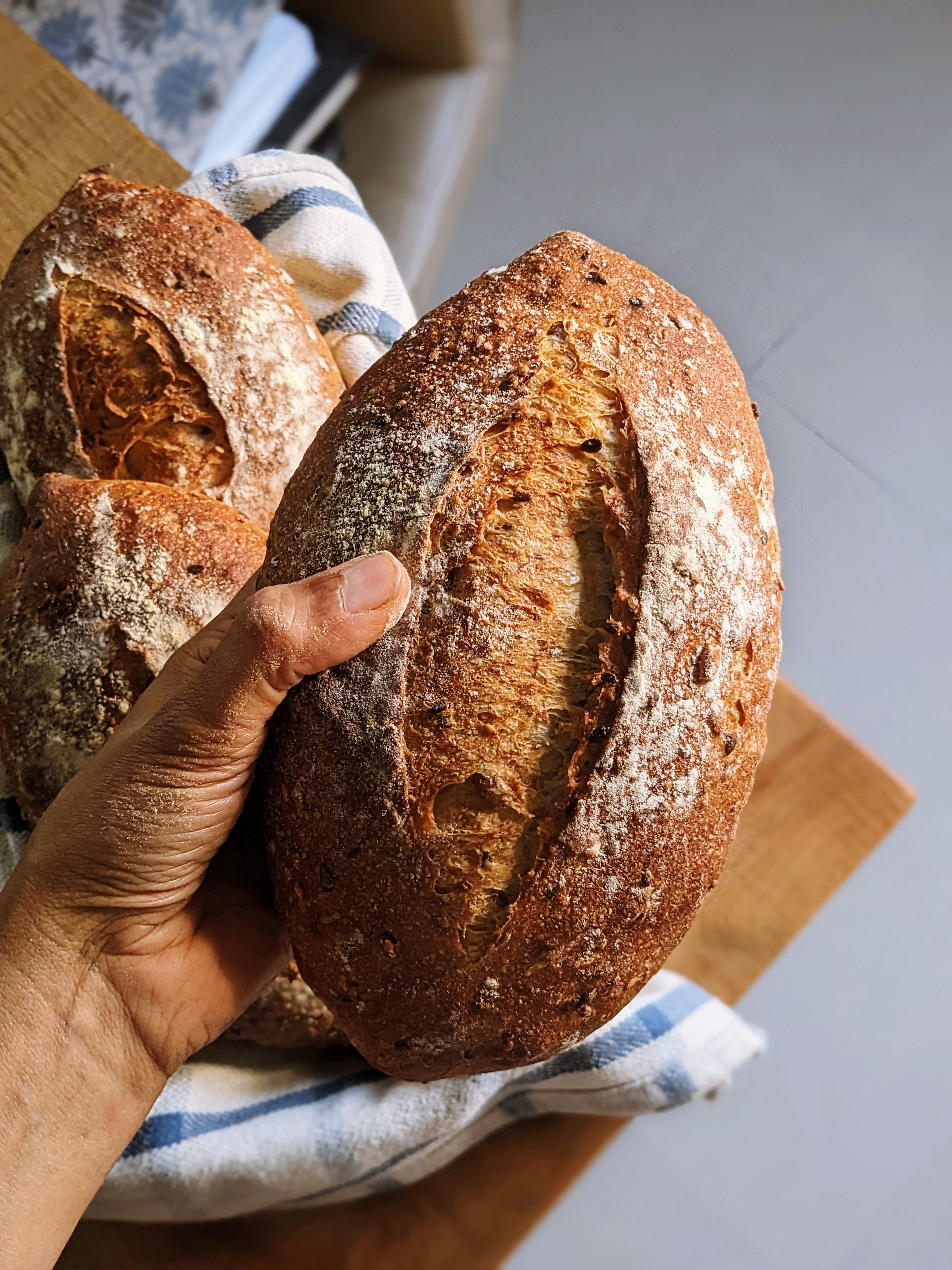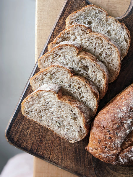 This loaf is 50% wholewheat and is loaded with seeds and rolled oats, giving it heft but also making the crumb fluffy & tender. It's wonderful untoasted when fresh with salted butter and / or jam but also makes for a great toast after 2 days. This is a super versatile bread - as we found out - and can be easily used as a side to soups, salads, stews and stir fries, other than being a perfect accompaniment to your morning eggs.