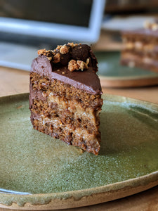 We have been wanting to make a decadent & tall layered VEGAN cake for a while now. First we tackled the cake. The flavours we leaned towards were caramel, banana and chocolate. So the cake here is caramelized banana cake with deep notes of jaggery - toasty, moist and without any need of eggs & butter. We also experimented with a creamy element and have made a 'custard' with jowar and house made cashew milk with a touch of hazelnut butter, again house made. The dark chocolate ganache frosting helps balance things. Sweet, salty, caramelly, nutty - it all works together.