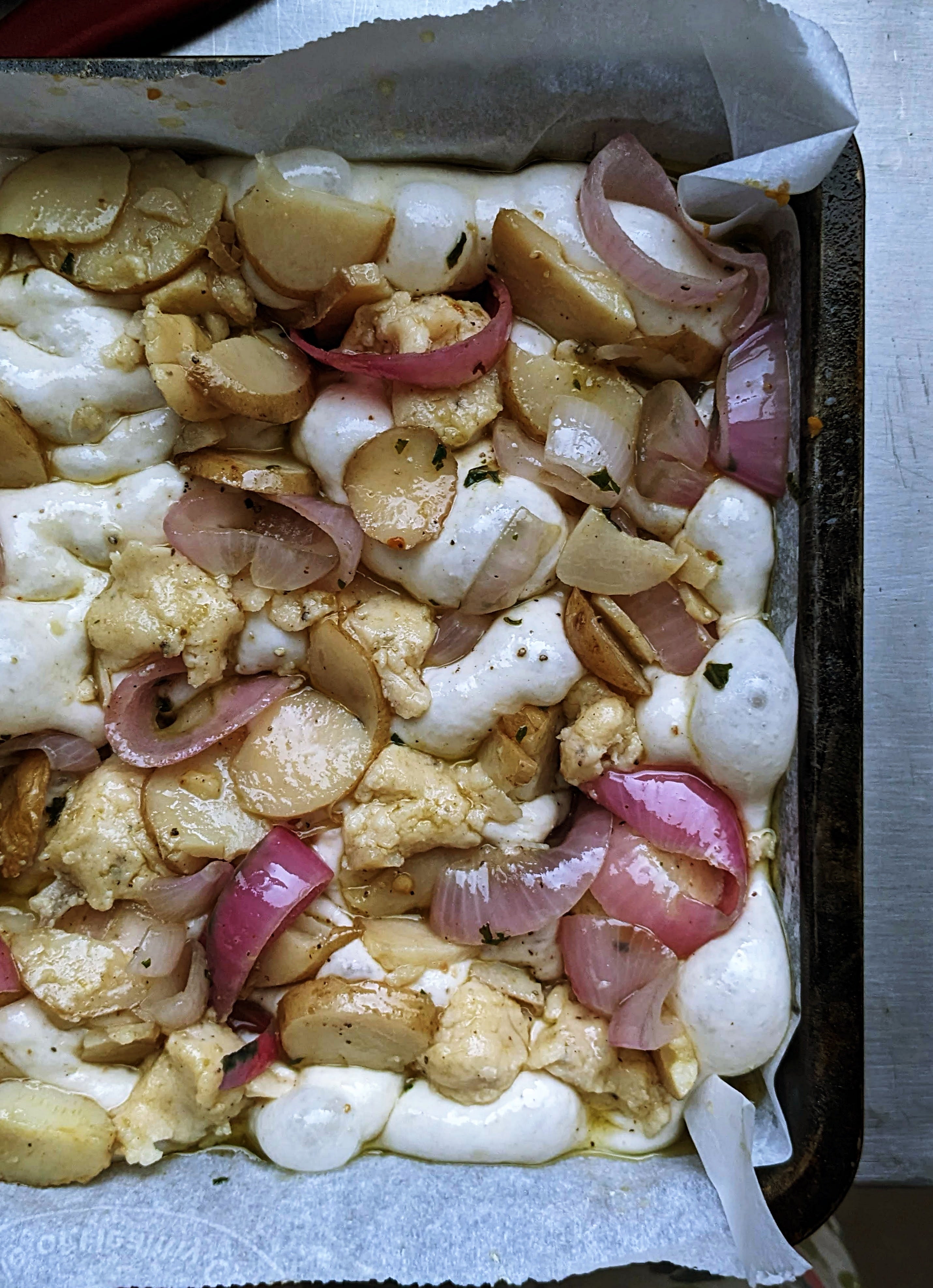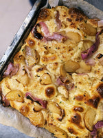 This new variant of focaccia has a blanket of cheese sauce baked on top along with slices of confit potatoes and rings of onion. This combination of cheese, potato and onion is considered a classic for a reason and here it works perfectly with the slightly tangy sourdough bread.