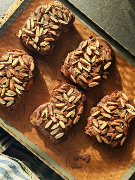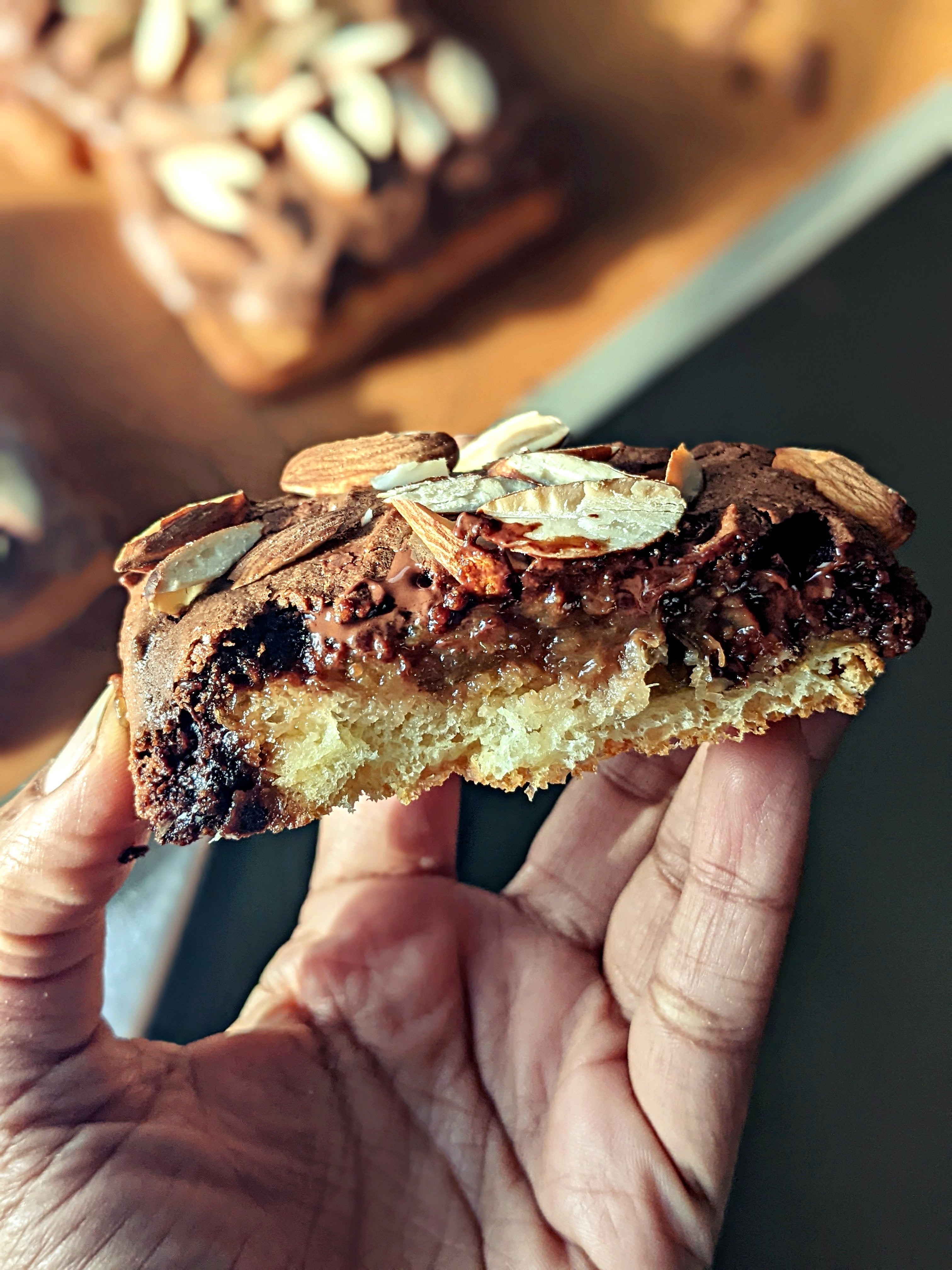 For this version we have used house made fig & orange compote while tweaking our Almond cream into a beautiful & luscious Chocolate Almond Cream. We have also sneaked in a tiny bit of candied orange to give it brightness and to highlight the citrus element which pairs gorgeously with the chocolate. It's gooey, chocolatey, fruity, nutty & super addictive. Try it for yourself.