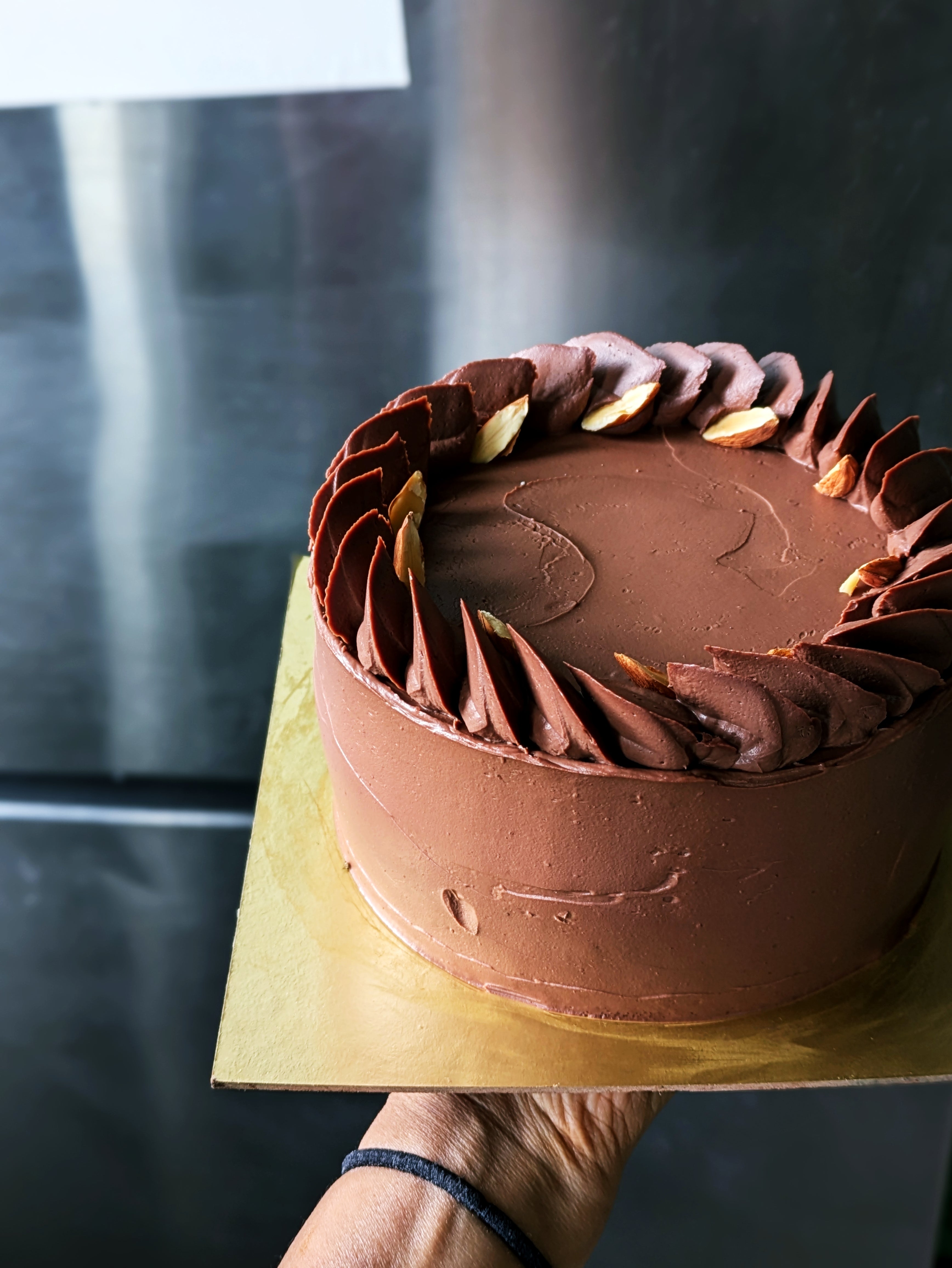 As a final flourish the whole ensemble gets enrobed in a soft set sourcream ganache and a few candied almonds. This cake is sure to be a spectacular and decadent end to any meal but in our humble opinion it's even better savoured as a personal moment of indulgence (which we highly encourage).