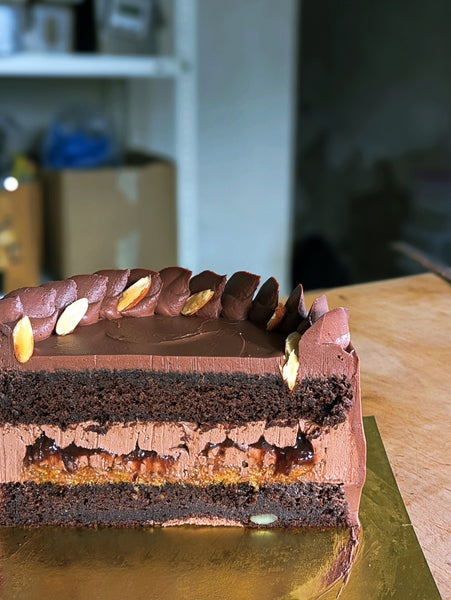 It comprises two layers of ultra moist chocolate sponge which sandwiches a thick, creamy and luscious layer of Chocolate mousse. Hiding within the mousse is a tart & bright house made plum compote which is a perfect foil to the dark chocolate goodness. Just for fun we also added a house made feuilletine and almond praline crunch layer - the fact that it adds a beautiful texture is the cherry on the cake.