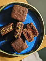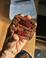 We have been wanting to make a Peanut Butter Cookie since forever, never landing on the right texture or flavor. This cookie brings it together effortlessly. We have combined a few components here that produce a super interesting interplay of flavours and textures. The cookie itself is crispy, chewy & deeply chocolatey with a background flavour of PB (which is house-made). The cookies get sandwiched with a Chocolate & PB cream while hiding a pool of strawberry jam. The final flourish is a shower of chopped toasted peanuts. Seemingly decadent but oh-so-perfectly balanced and will go equally well with a cup of coffee or a glass of milk.