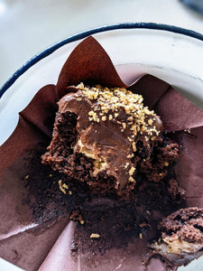 This teacake is made entirely with wholegrains & sweetened with unrefined sugar but it's unlikely you will know it. Made using organic ragi flour and a bit of atta, this cake is soft, tender & with a super chocolately flavour. The jaggery in the cake adds a depth of flavour that's complex and moreish. We also add some dark chocolate chips to the cake batter to add to the decadence without adding much sweetness..