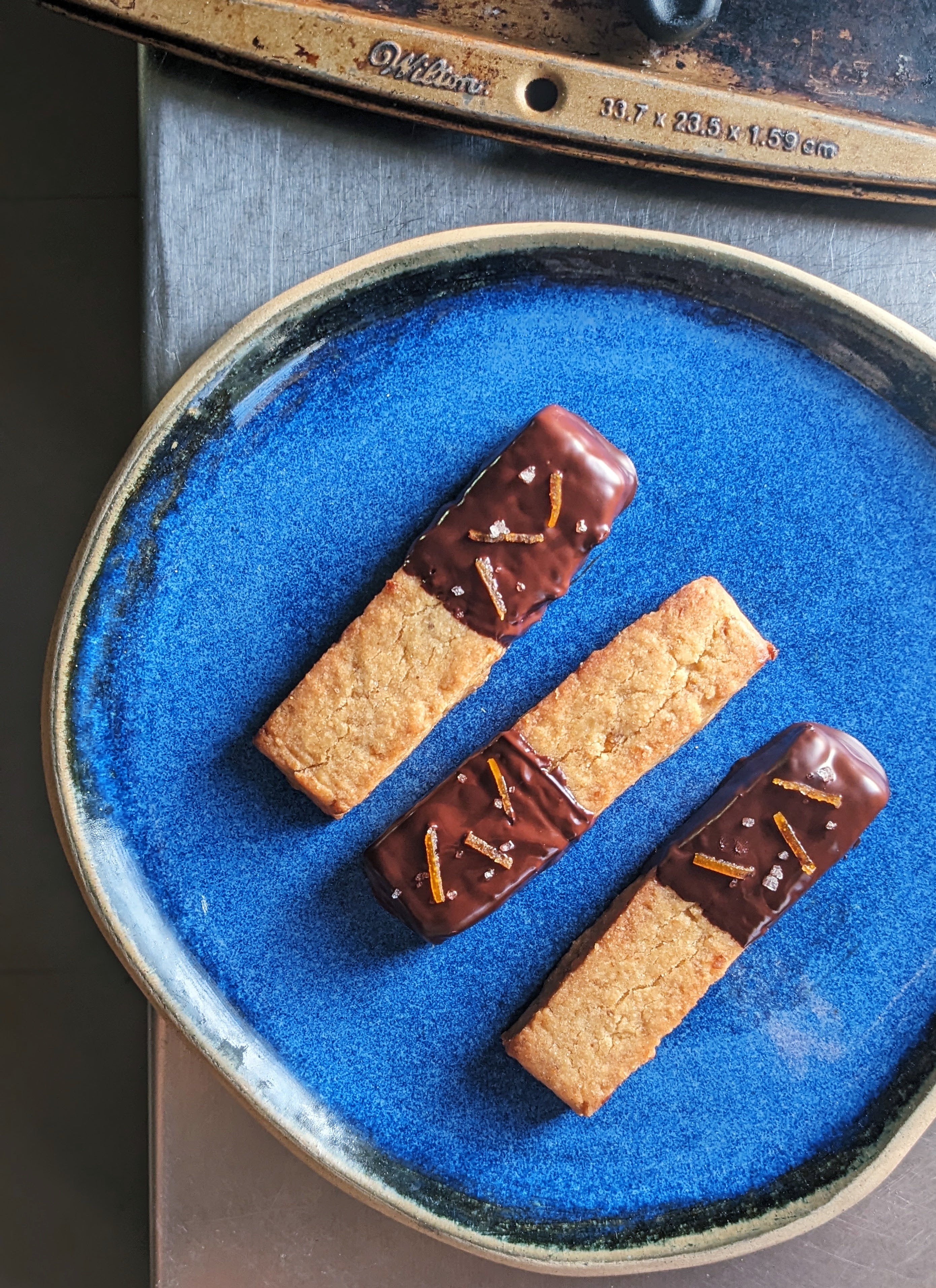 A play on THE classic combination of orange and chocolate, here we have perfumed the shortbread dough with candied orange and it gets dipped in dark chocolate after baking. Finished off with some flaky salt, it's an absolute festive treat!